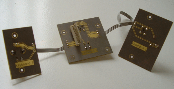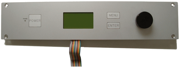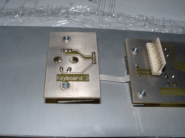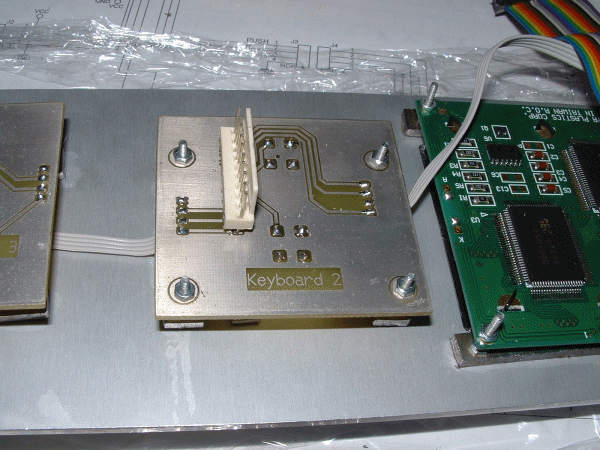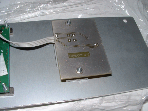 Unten kann man das Ergebnis dieser Befestigungstechnik sehen. "Keyboard 3" ist die Platine mit dem Winkelencoder, daneben die Platine mit den beiden Tastern ("Keyboard 2"). Diese Platine hat außerdem noch einen Stecker, mit der die Bedienungselemente der Frontplatte mit der Controllerplatine verbunden sind. Rechts sieht man auch noch die Befestigung des LC-Displays, welche genau so wie die der Tasterplatinen aufgebaut ist. Auf dem unteren Bild sieht man die Platine ("Keyboard 1") mit dem Power-Taster und der Standby-LED.