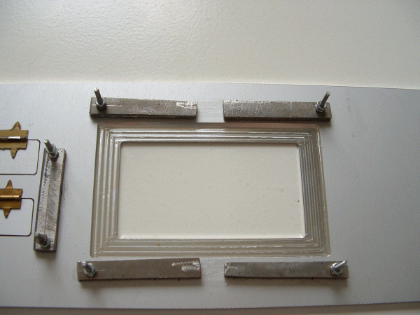 Die Tasten habe ich dann mit kleinen Scharnieren (aus einer Zigarrenkiste,1) an die Frontplatte befestigt. Damit die Tasten bündig mit der Frontplatte sind, habe ich hinter den Tasten kleine Plätchen Platinenmaterial (2) geklebt, wodurch die Tasten nur noch nach innen scharnieren können. Für die eigentlichen Taster habe ich kleine Platinen gemacht, die hinter den Tasten geschaubt werden. Zur Befestigung der Platinen wollte ich natürlich keine Löcher in der Frontplatte bohren. Deswegen habe ich Eisenstücke (3) zurechtgesägt, in denen ich dann die Schrauben (4) festgeschraubt und verklebt habe. Diese Eisenteile wurden auf der Rückseite der Frontplatte geklebt. Zur Befestigung der Platine mit dem Winkelencoder habe ich die gleiche Technik anwendet (5). Außerdem ist in der Mitte noch eine Achsdurchführung (6).